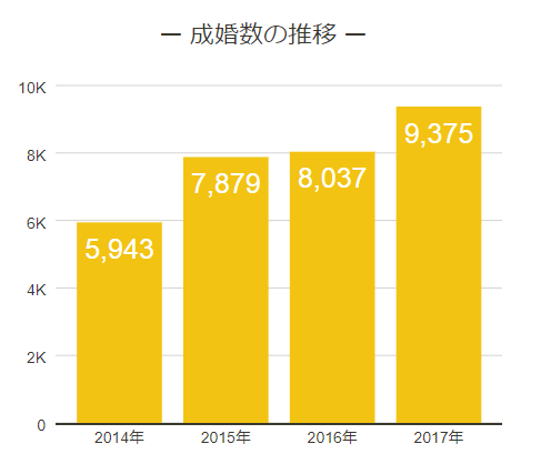 2017年、IBJ日本結婚相談所連盟全体で9,375名を成婚へと導きました。過去最高の成婚数となり、2006年の設立以降、右肩上がりで増え続けています。