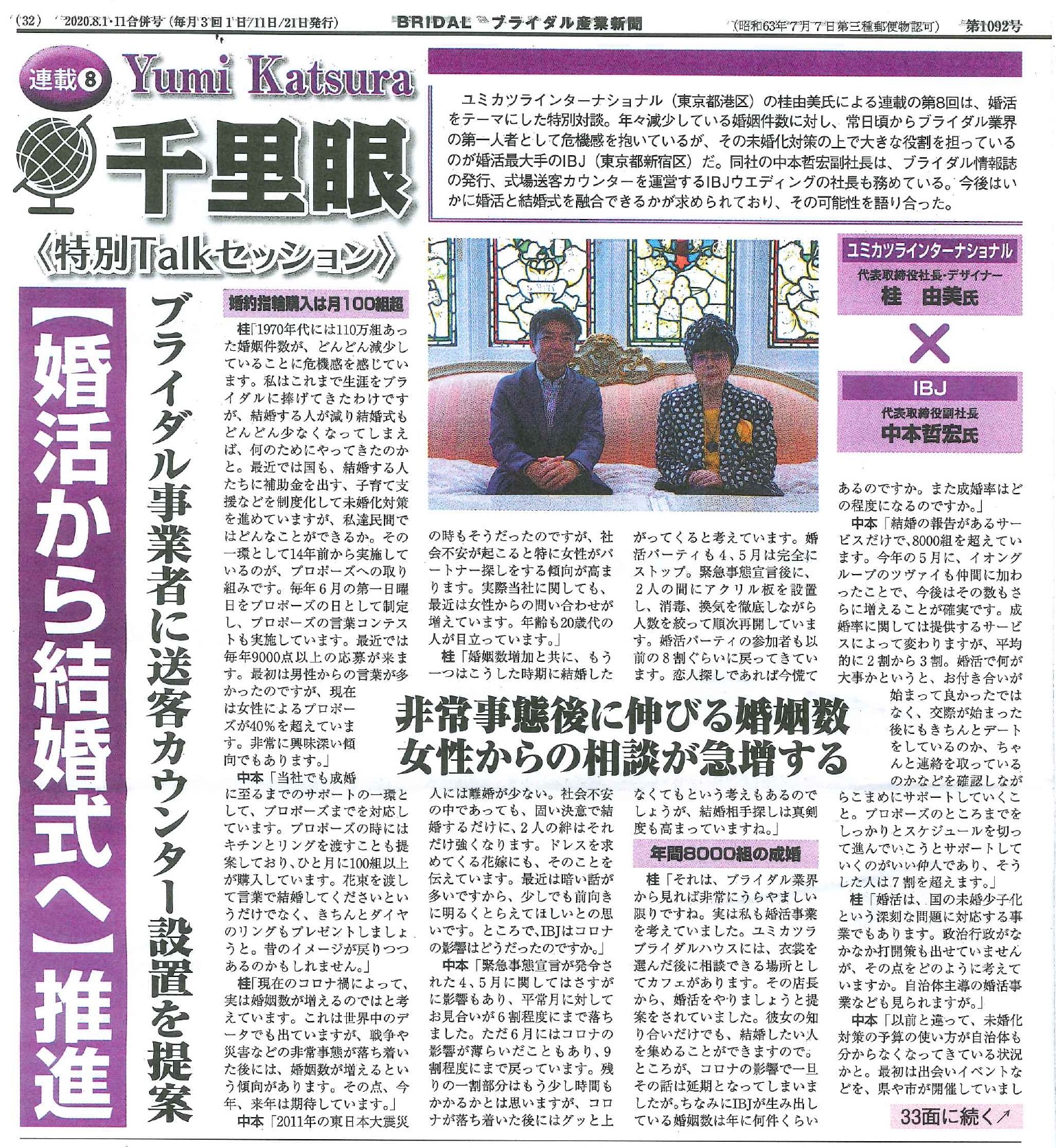 2020年8月発行のブライダル産業新聞に、株式会社ユミカツラインターナショナル(東京都港区)代表取締役社長 桂由美さんと、株式会社IBJ(東京都新宿区)代表取締役副社長 中本哲宏による「婚活をテーマにした特別対談」が掲載されました。