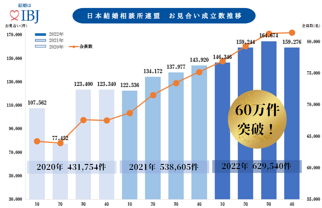 株式会社IBJ(代表取締役社⻑:⽯坂 茂、本社:東京都新宿区、東証プライム:6071)が運営する会員数・成婚数ナンバーワン*¹の結婚相談所ネットワーク「⽇本結婚相談所連盟」にて、2022年1月~12月の年間お見合い成立数が60万件を突破しました。