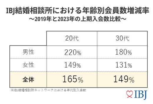 IBJグループにおける結婚相談所の入会者は年々増加し、2023年9月には4,317名(2019年比で44%増)となりました。特に若い世代が増え、20代の入会者は2019年比で165%に。新規入会者が増えることで既存会員のお見合い活動も活発になっていくため、プラットフォーム全体が活性化されていきます。