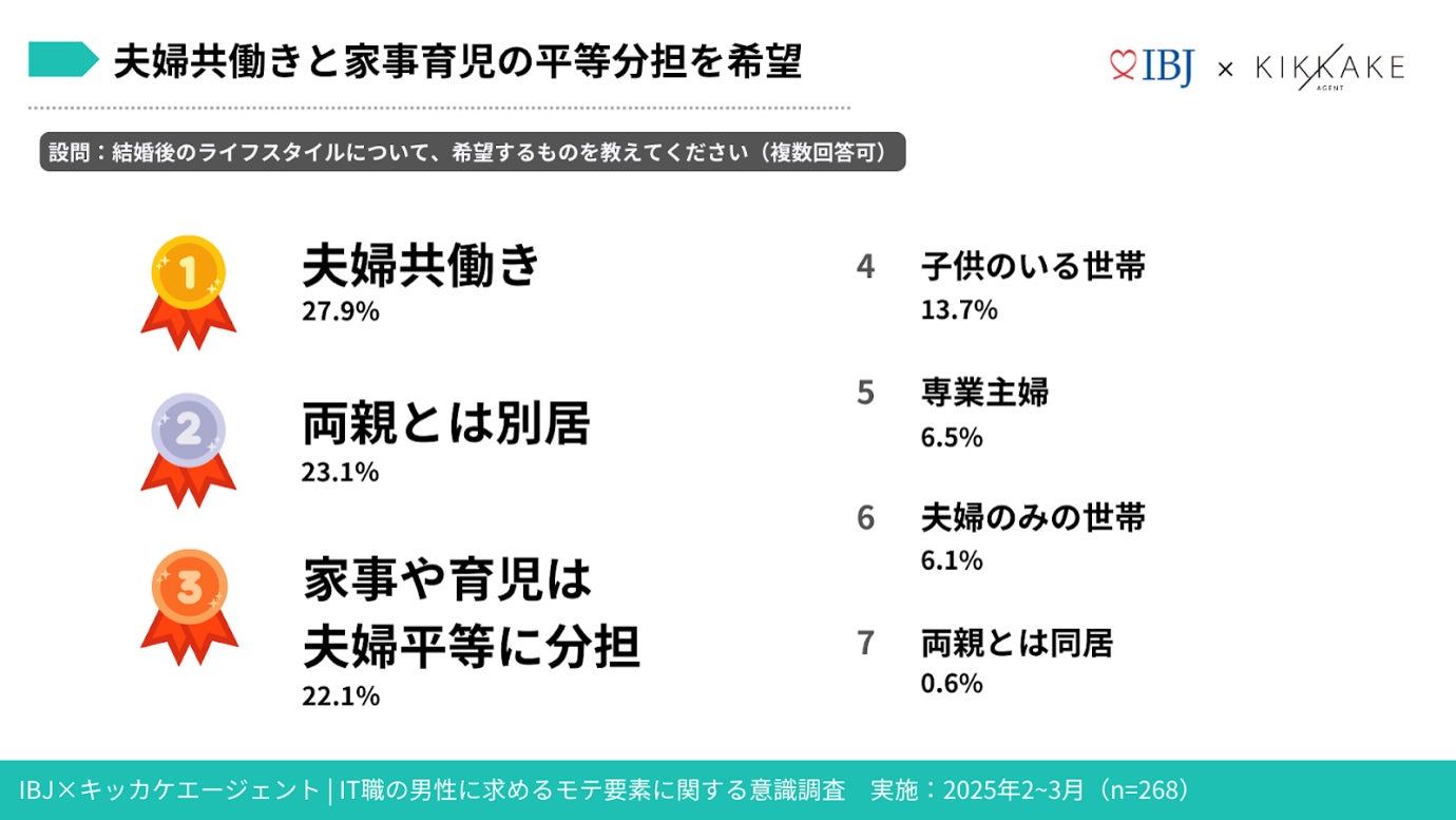 結婚後の理想のライフスタイルについては、「夫婦共働き(27.9%)」「(両親or義両親と)別居(23.1%)」「家事や育児は夫婦平等に分担(22.1%)」が上位に並びました。特に共働きと家事育児の平等分担を希望する声が多く、経済的な安定だけでなく、パートナーシップとしてのバランスを重視する価値観がうかがえます。また、親との同居よりも「別居」を選ぶ回答が多かったことから、程よい距離感を保ちながら自立した家庭を築きたいという傾向も見られました。