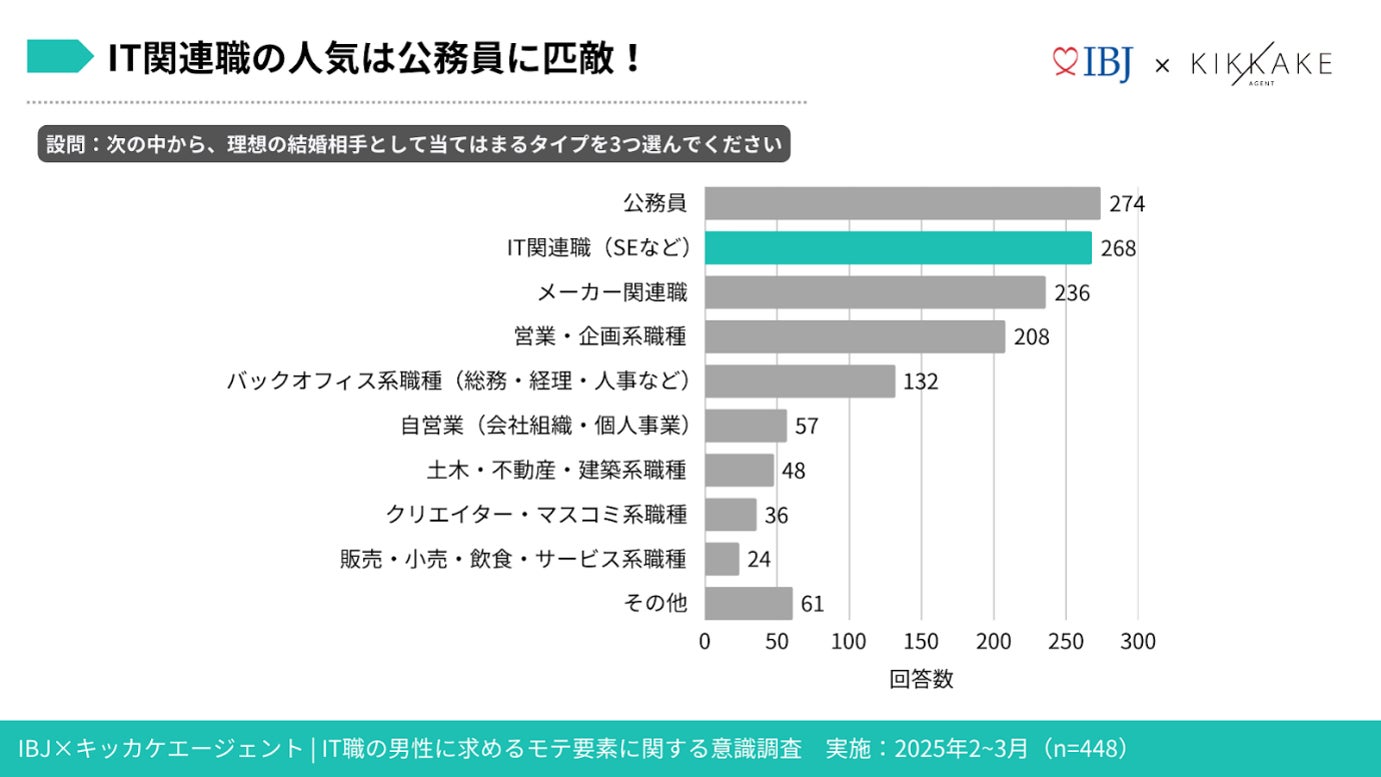 株式会社IBJ(本社:東京都新宿区、代表取締役社長:石坂 茂、東証プライム:6071、以下「IBJ」)は、「良い未来を、いまカタチに。」をミッションに掲げ、ITエンジニア向け転職支援サービス「キッカケエージェント」を運営する株式会社キッカケクリエイション(本社:東京都渋谷区、代表取締役社長:川島我生斗)と「IT職の“モテ要素”に関する意識調査」を実施しました。