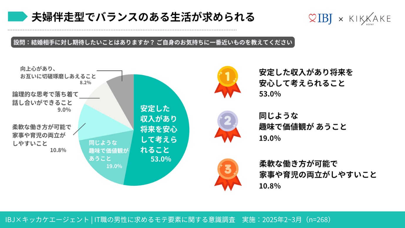 今回の調査で、IT職の男性に対する女性の関心の高さと、理想の結婚相手像が「生活を共に築ける、夫婦伴走型のパートナー」であることが明らかになりました。安定した収入に加え、家事や育児にも積極的に関わる姿勢が重視され、“ともに暮らしをつくる関係性”が、今の時代に求められるパートナー像だと言えるかもしれません。