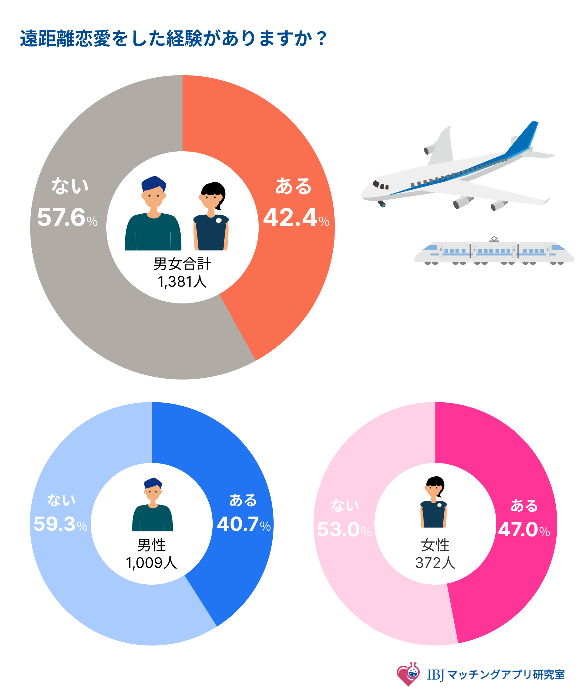 恋愛経験がある方に遠距離恋愛の有無を調査したところ、42.4%が「経験がある」と回答。男女別では、女性のほうが6.3ポイント高い結果となり、約半数の女性は遠距離恋愛の経験があることがわかりました。