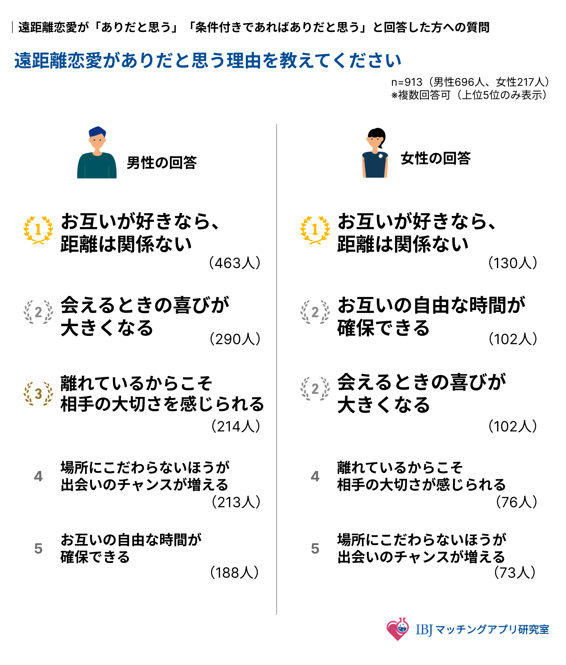 遠距離恋愛を肯定する理由の第1位は、男女ともに「お互いが好きなら、距離は関係ない」という回答。 「恋愛は“どこにいるか”ではなく、“誰といたいか”だと思う(50代男性)」という声も寄せられ、物理的な距離よりも感情的なつながりを重視する傾向が見られました。また、「お互いの自由な時間が確保できる」という理由は、男性で5位に対し女性では2位にランクイン。自分の時間を大切にしたいと考える女性が増えている傾向もうかがえます。