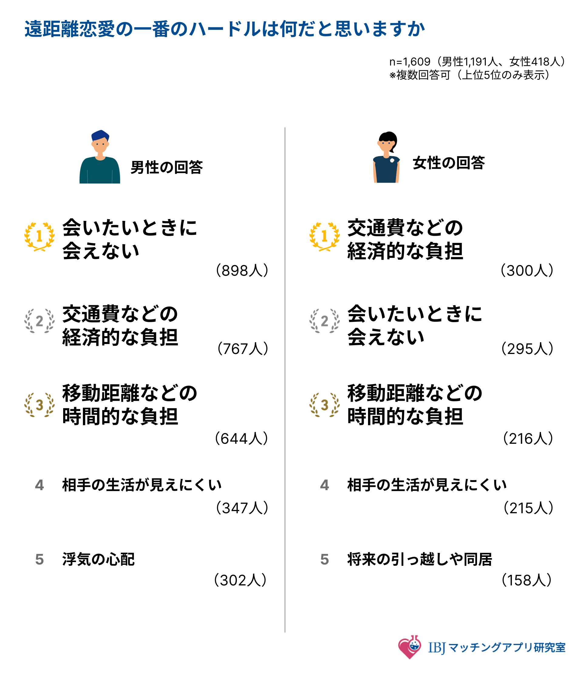 遠距離恋愛におけるハードルとして、男性の最多回答は「会いたいときに会えないこと」。一方、女性は僅差ながら「交通費などの経済的な負担」が最多でした。「高速で片道2時間の距離を月2回通っていました。毎月5万円ほど出費があり、距離は感じなかったけれど、結婚に向けての貯金ができず苦しかったです(40代女性)」といった声も挙がりました。