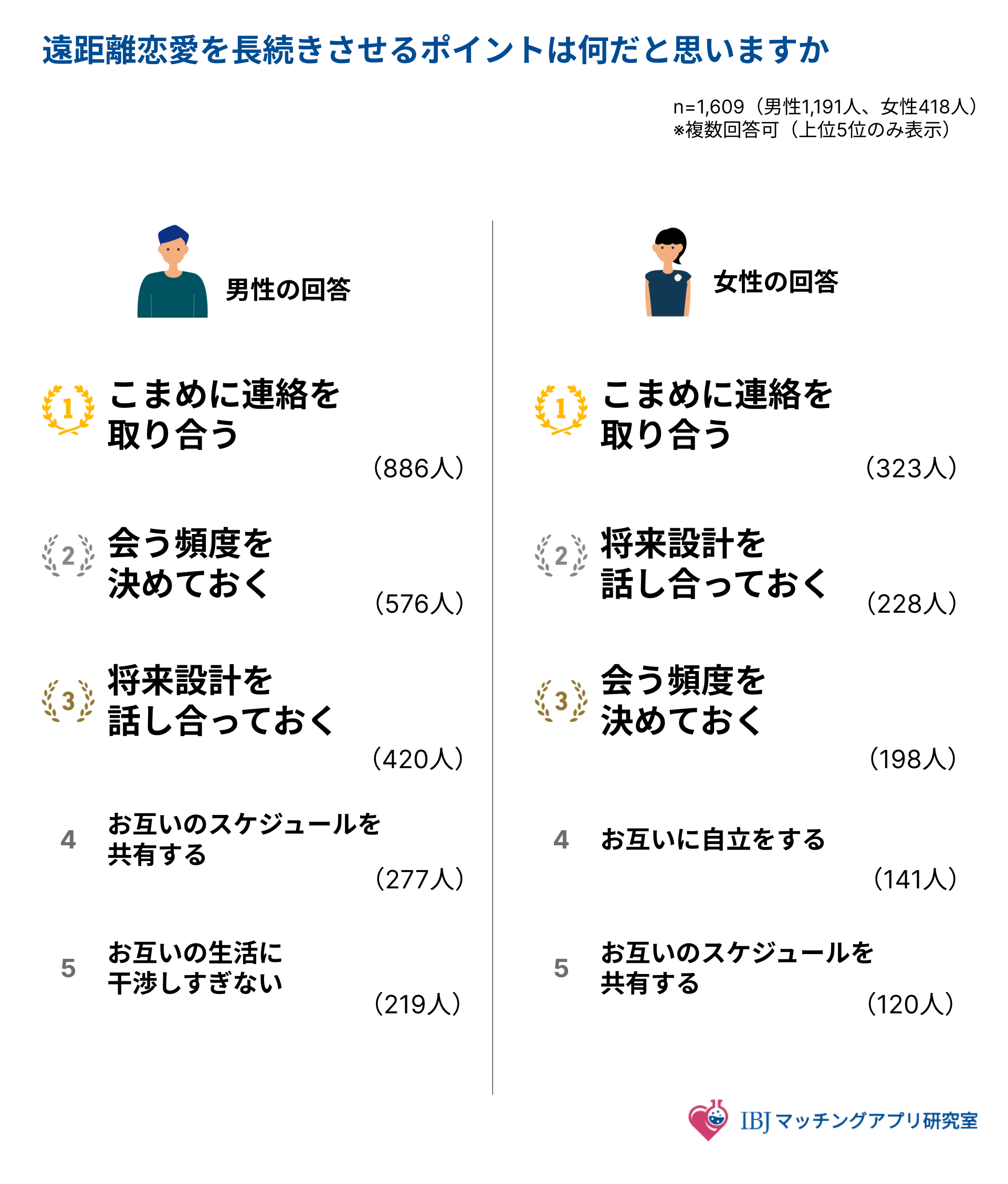 長続きさせるポイントについては男女で大きな差はなく、「こまめに連絡を取り合う」「会う頻度を決めておく」「将来設計を話し合っておく」という項目が上位に並びました。いつでも会える関係ではないからこそ、「安心感の共有」が鍵となっているようです。