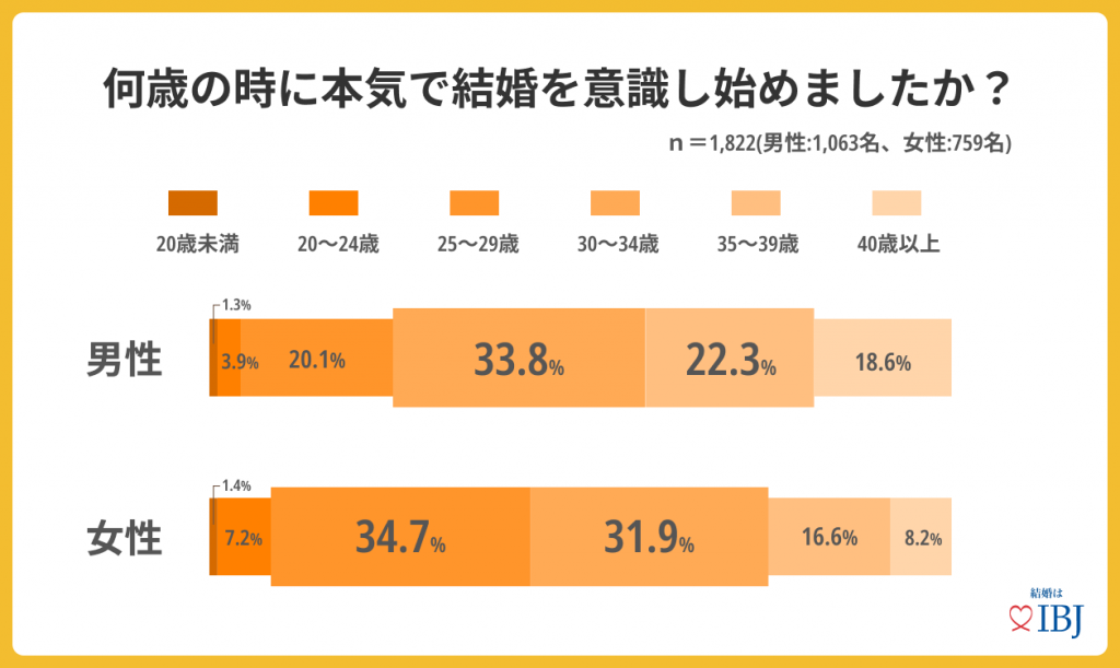 - 男性は「30~34歳」、女性は「25~29歳」の時に本気で結婚を意識し始める。