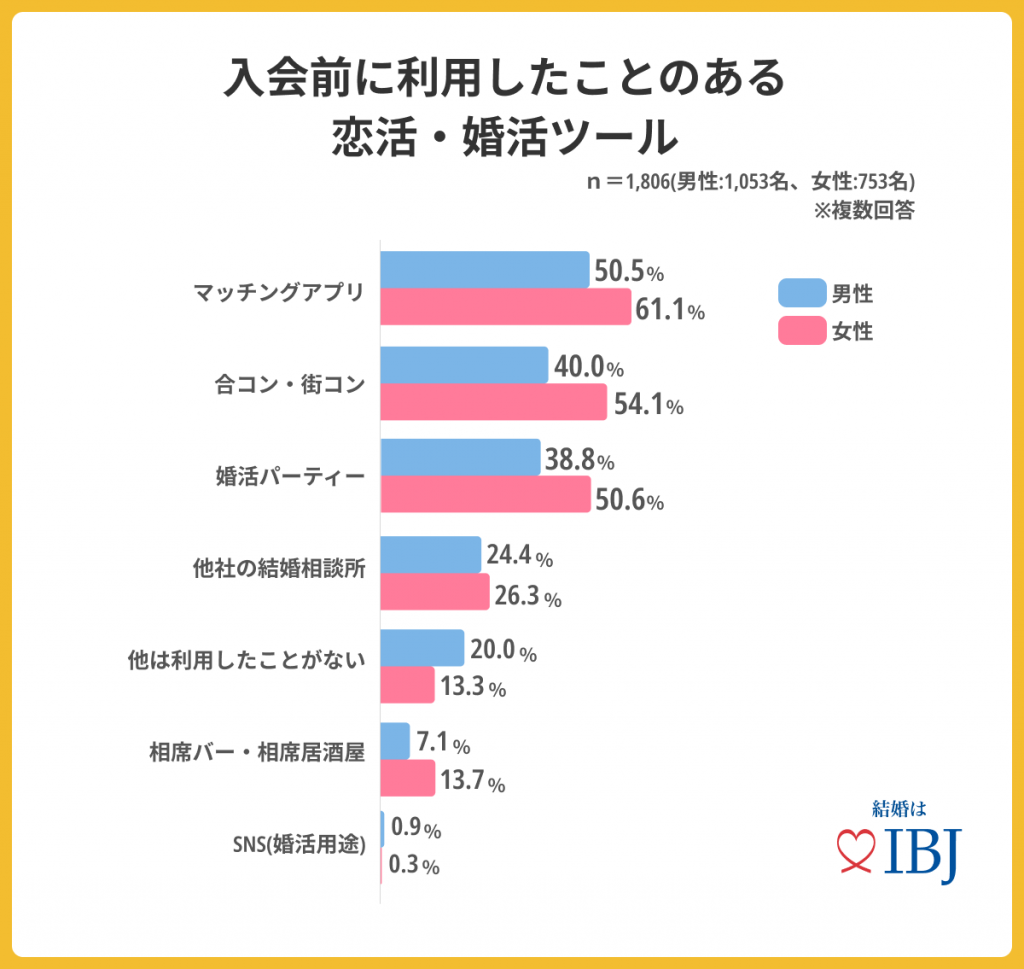 結婚相談所の入会前に、利用したことのある恋活・婚活ツールとして男女共に「マッチングアプリ」が最多となりました。他のツールを利用してから結婚相談所に入会する傾向が高い事が分かります。
