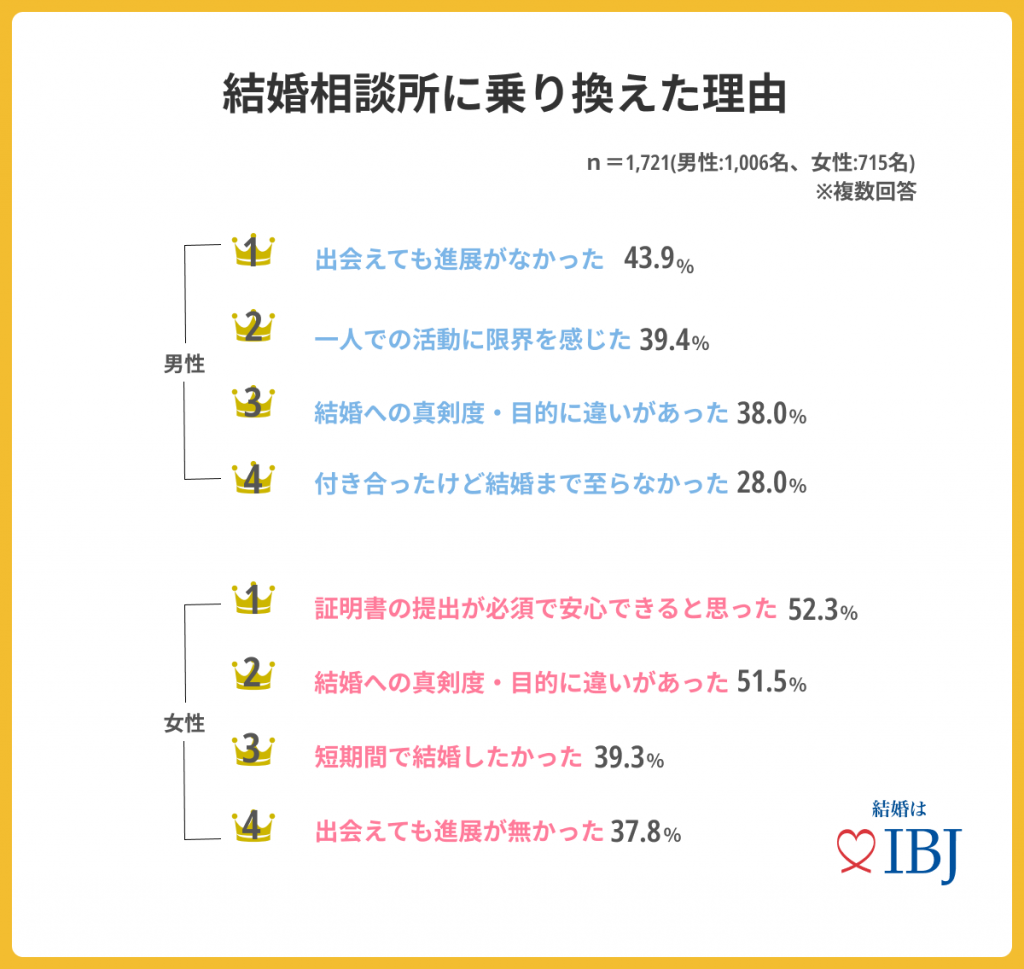 - 結婚相談所に乗り換えた理由として、男性は「出会えても進展がなかった(43.9%)」女性は「結婚への真剣度・目的に違いがあった(51.5%)」が最多。
