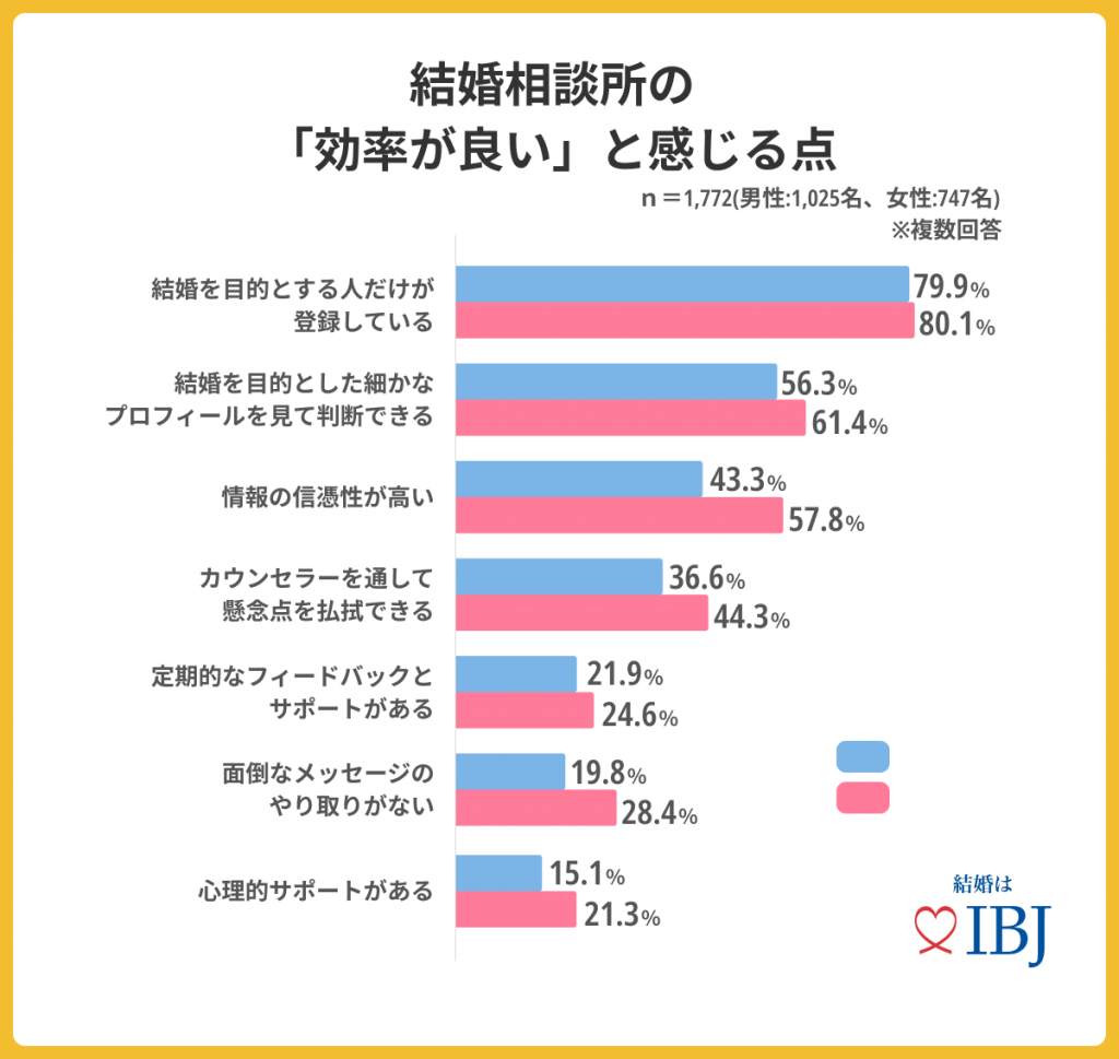 - 結婚相談所の「効率が良い」と思う点は、8割の男女が「結婚を目的とする人だけが登録している」を選択。