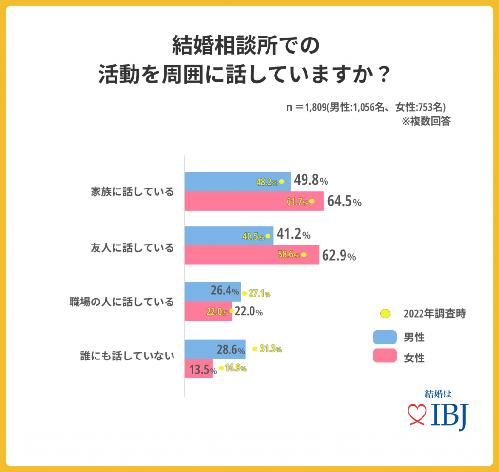 - 結婚相談所での活動を周囲の方に「話してない」方は2年間前の調査時より減少。