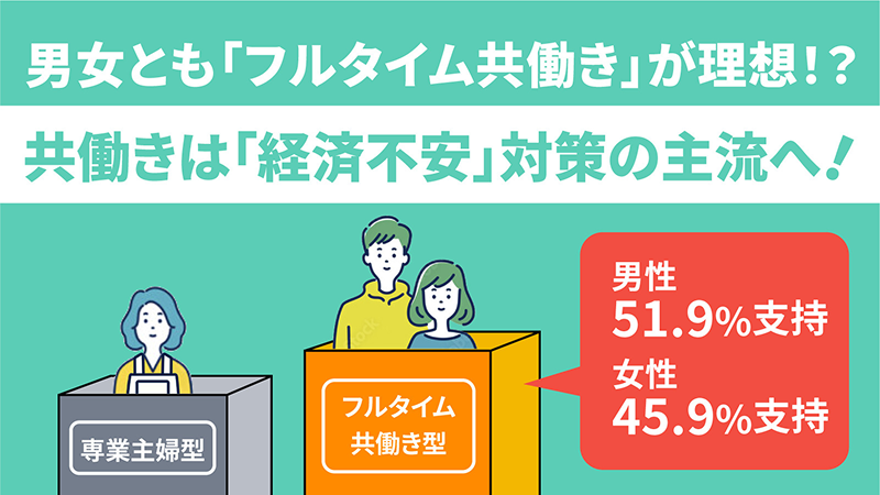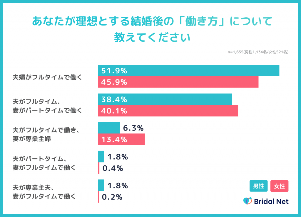 - 理想の結婚後の働き方は「フルタイムでの夫婦共働き」が男女共に最多