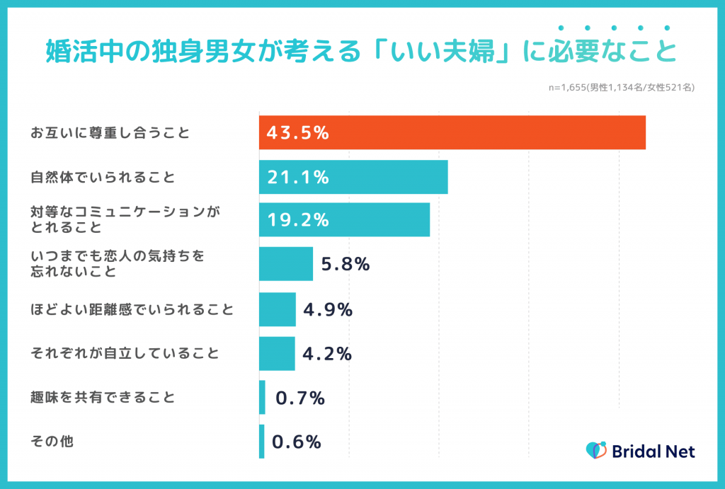 婚活中の独身男女が考える「いい夫婦像」について調査したところ、1位「お互いに尊重し合うこと(43.5%)」、2位「自然体でいられること(21.1%)」、3位「対等なコミュニケーションがとれること(19.2%)」となりました。