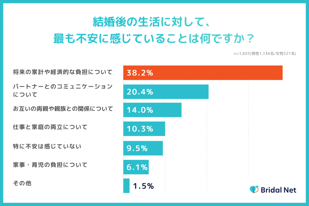 - 結婚後の生活に対する不安第一位は「将来の家計や経済的な負担」