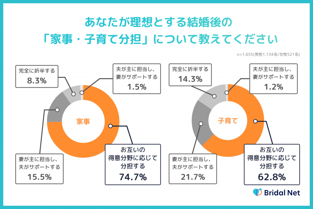 家事・子育ての分担については「お互いの得意分野に応じて分担する」がどちらも最多で、共働きの環境だからこそ、協力しあって分担したいという方が多いようです。