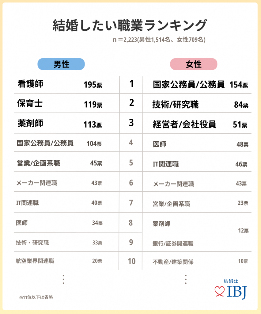 - 理想の結婚相手の職業として、男性は「看護師」女性は「国家公務員/公務員」が1位に。