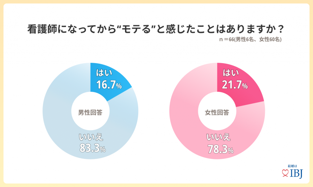 - 現役看護師の方に「看護師になってから“モテる”と感じたことがあるか」と伺うと、8割弱の男女が「なし」と回答。