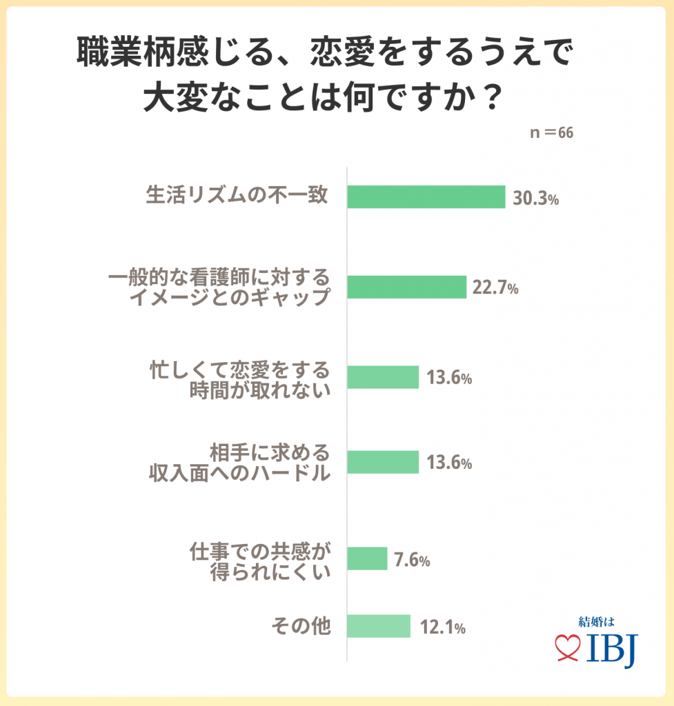 - 職業柄感じる、恋愛をするうえで大変なことは「生活リズムの不一致(30.3%)」が最多に。