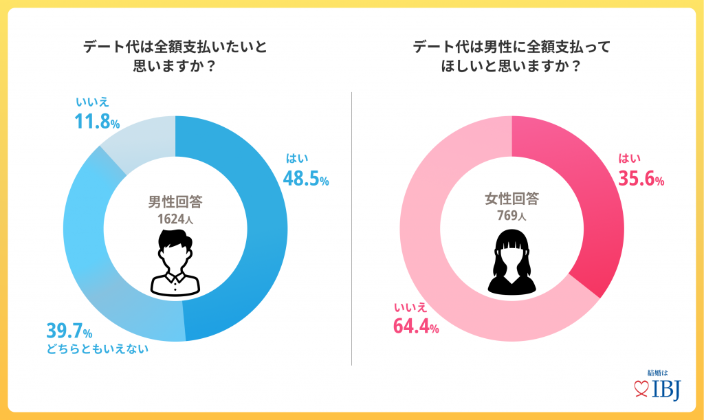 デート代の支払いについて、男性は全額支払いを望む方が48.5%と5割近くを占める一方で、女性は全額支払いを期待している方は35.6%という結果になりました。