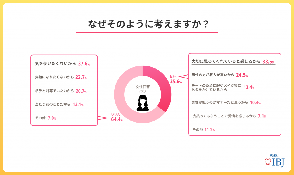 一方で全額払いを希望しない方は「気を使いたくないから(37.6%)」「負担になりたくないから(22.7%)」「相手と対等でいたいから(20.7%)」という理由が多く、自立した考えを持っている方も多いようです。