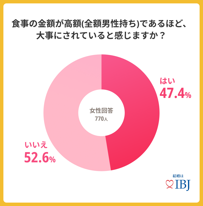 続いて、「食事の金額が高額(全額男性持ち)であるほど、大事にされていると感じますか」と伺うと、約半数の方が「はい」と回答しました。女性は、男性が支払ってくれたという行為に関して、“大事にされている” “特別”というような感情を抱く方が多いようです。全額支払いを希望しない方でも3割以上の方が「はい」と回答し、女性は目に見える“カタチ”で相手の「好意」を感じる傾向があるのかもしれません。