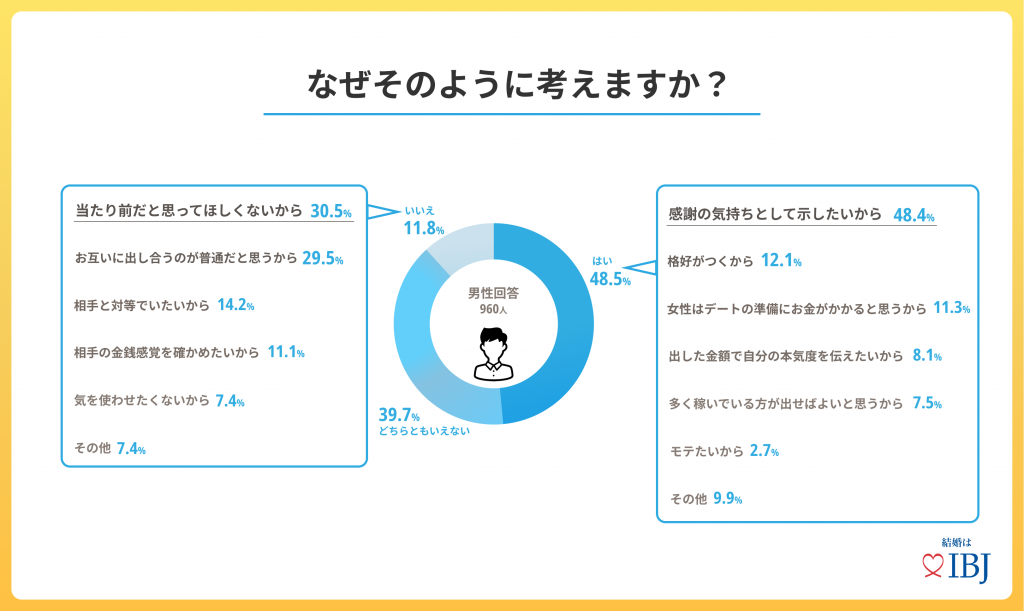 男性は、「感謝の気持ちを示す」ために全額払いを望み、女性は「大切にされている」と感じたいために全額払いを希望することが分かりました。